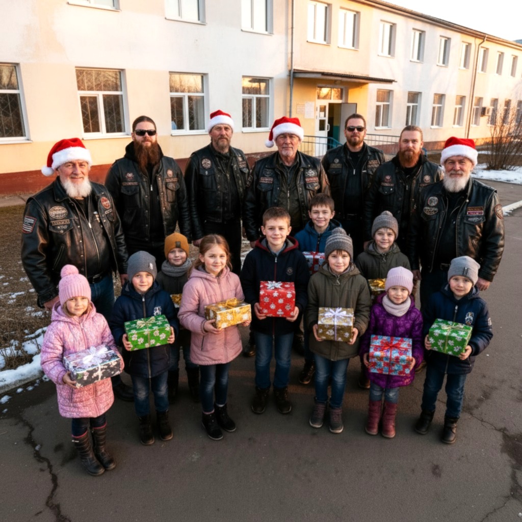 The bikers pulled into Riverside Children’s Home at six o’clock on Christmas morning, rolling up with three semi-trailers, five cargo vans, and so many wrapped gifts that they could have filled the entire gym from wall to wall.